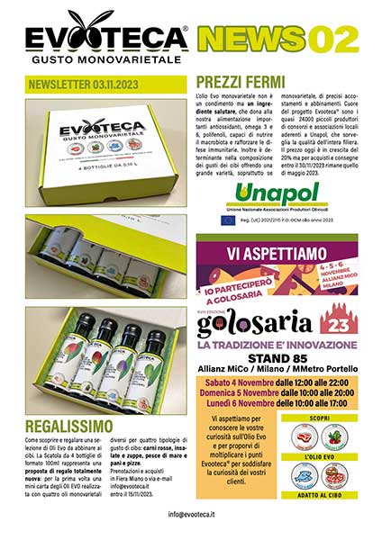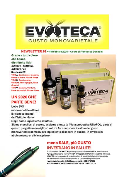 Tutti i prodotti EVOOTECA® provengono dalla FILIERA UNAPOL certificata da AGROQUALITÀ ai sensi della norma ISO 22005:2007 (Rintracciabilità di Filiera). UNAPOL è un consorzio di organizzazioni di produttori olivicoli che associa 14.750 produttori di 10 diverse regioni Italiane.