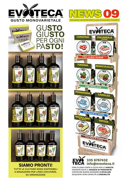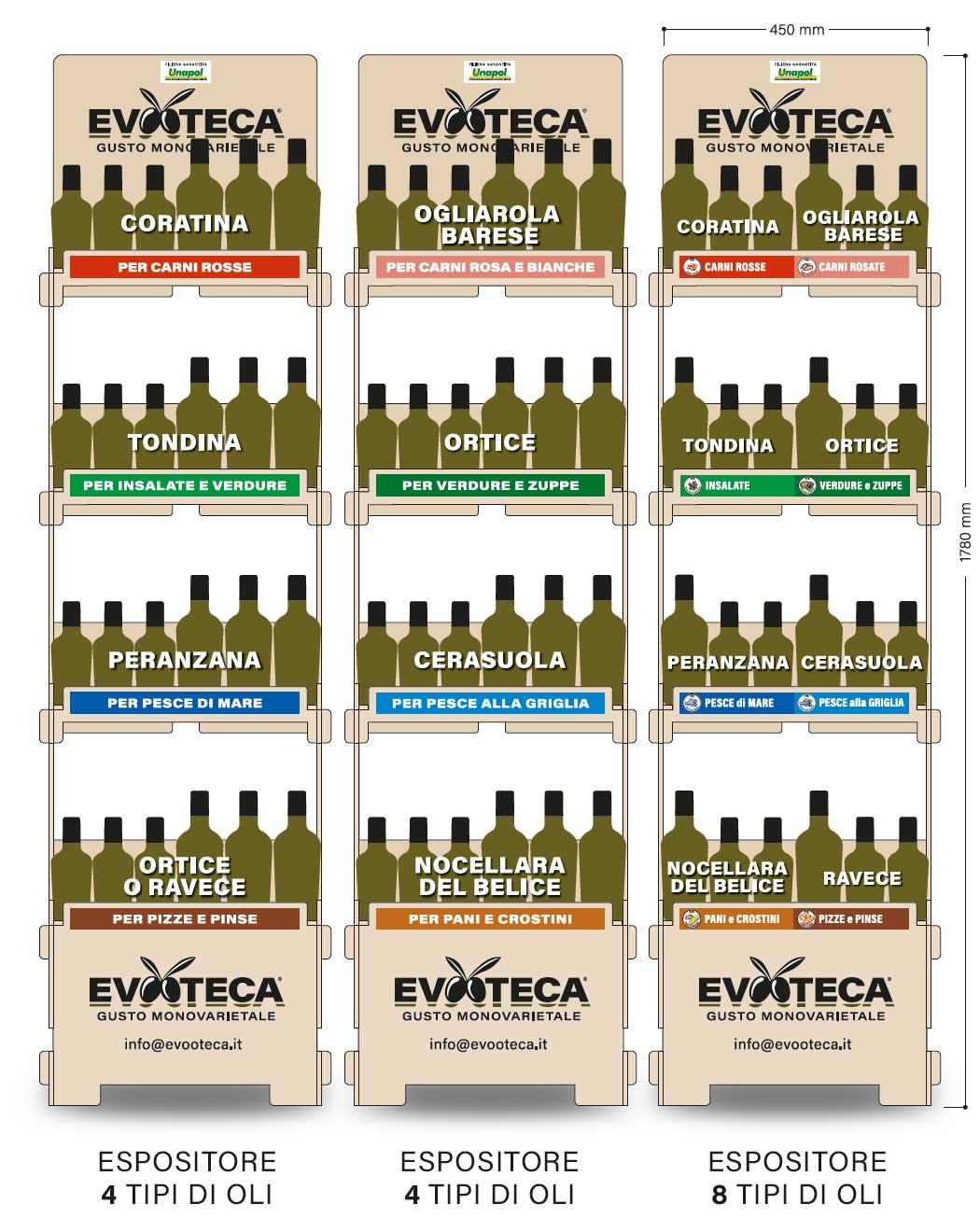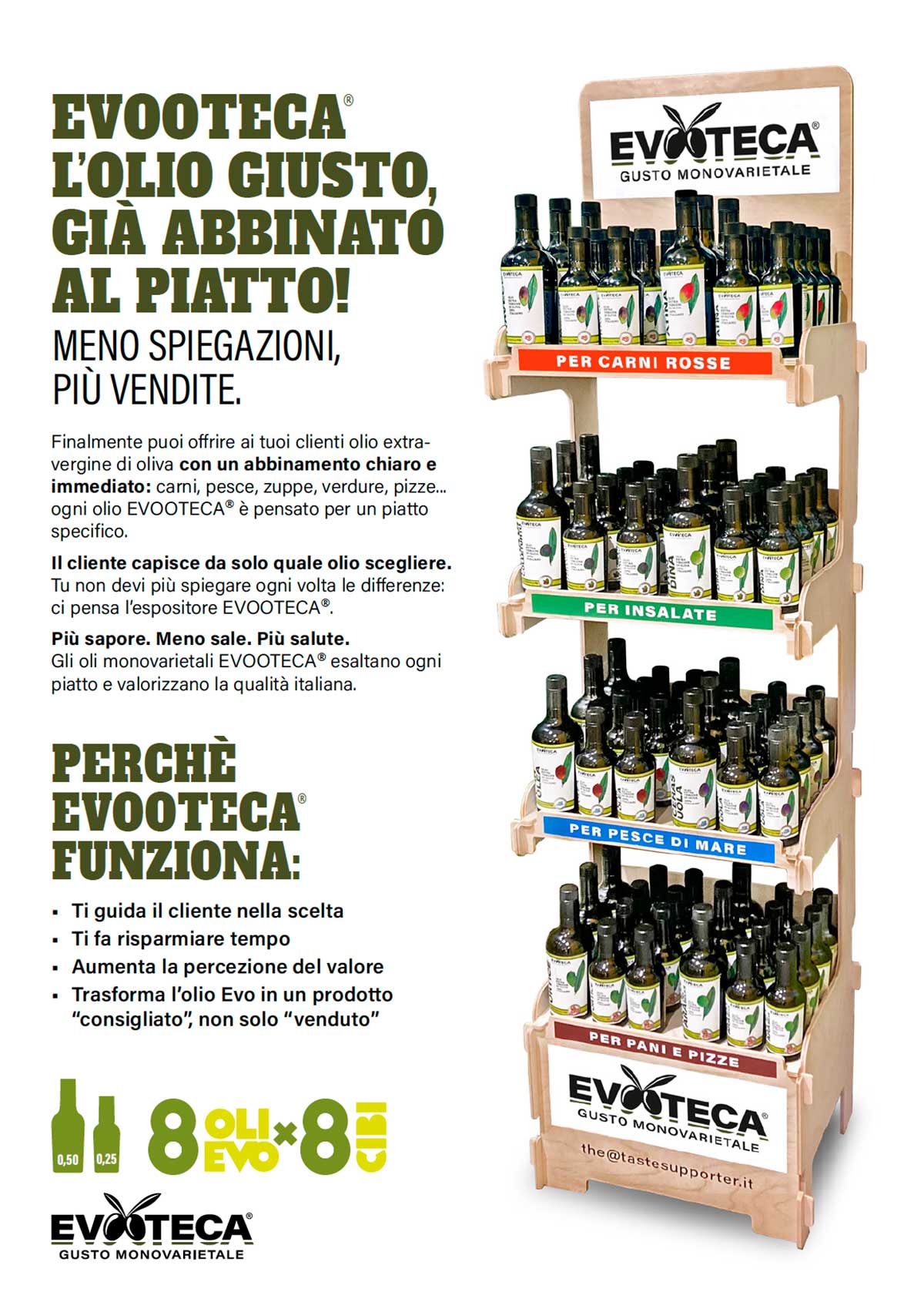 Un unico espositore, pratico e chiaro, per rinvenire l’Olio EVO consigliato da abbinare!