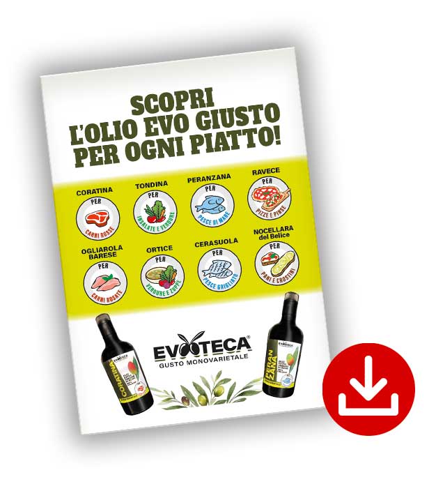 EVOOTECA® ci guida ad abbinarlo al meglio con i nostri piatti, scegliendo oli ottenuti da una sola varietà di oliva (detti “monovarietali”), capaci di esaltare ogni sapore. Risultato? Piatti più buoni, meno sale, meno zucchero, più gusto e salute a tavola!
