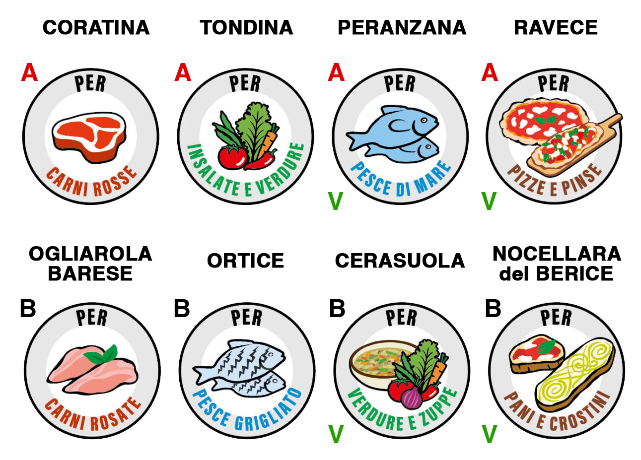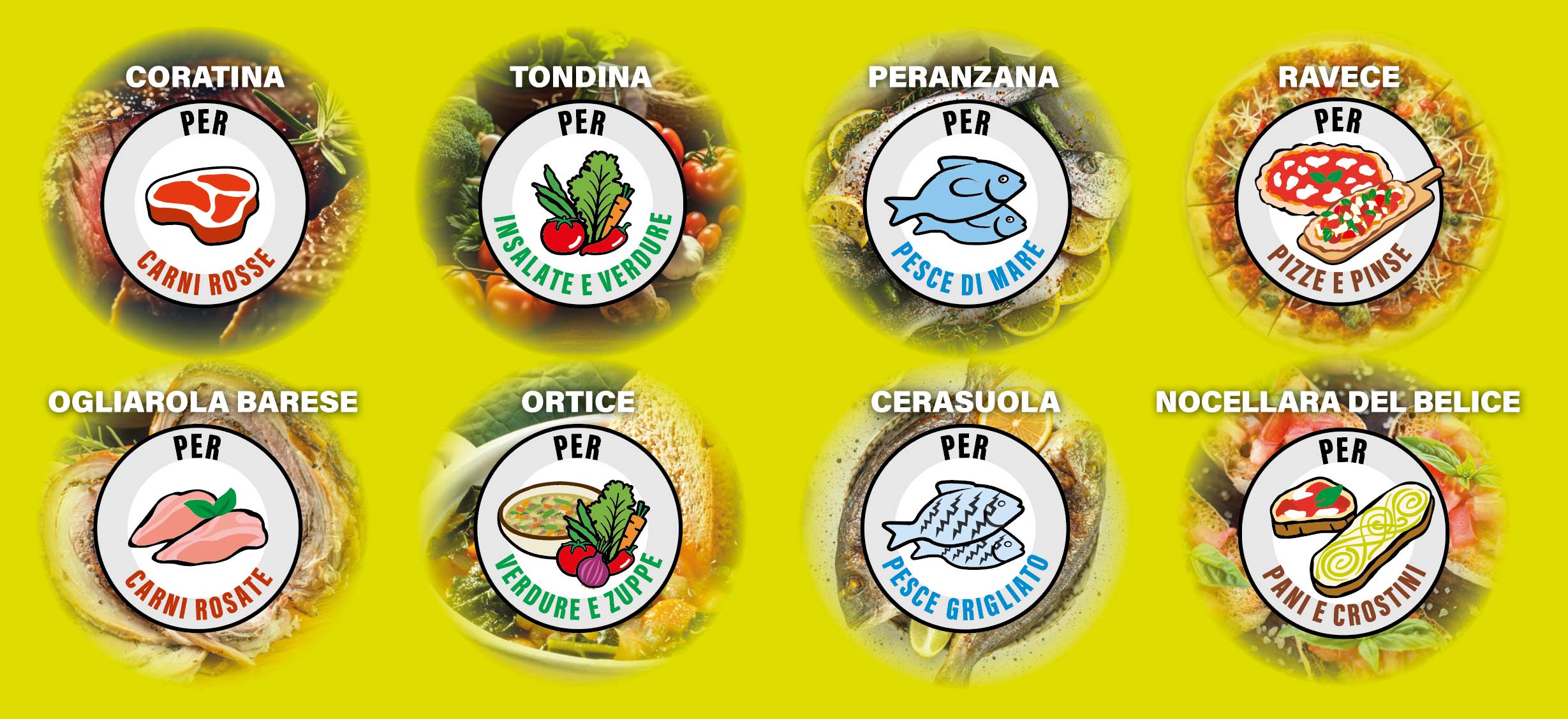 I nomi: Carni Rosse: Coratina, Pesce di Mare: Peranzana, Insalate: Tondina, Pani e Crostini: Nocellara del Belice, Carni Rosate: Ogliarola Barese, Pesce alla Griglia: Cerasuola, Verdure e Zuppe: Ortice, Pizze e Pinse: Ravece.